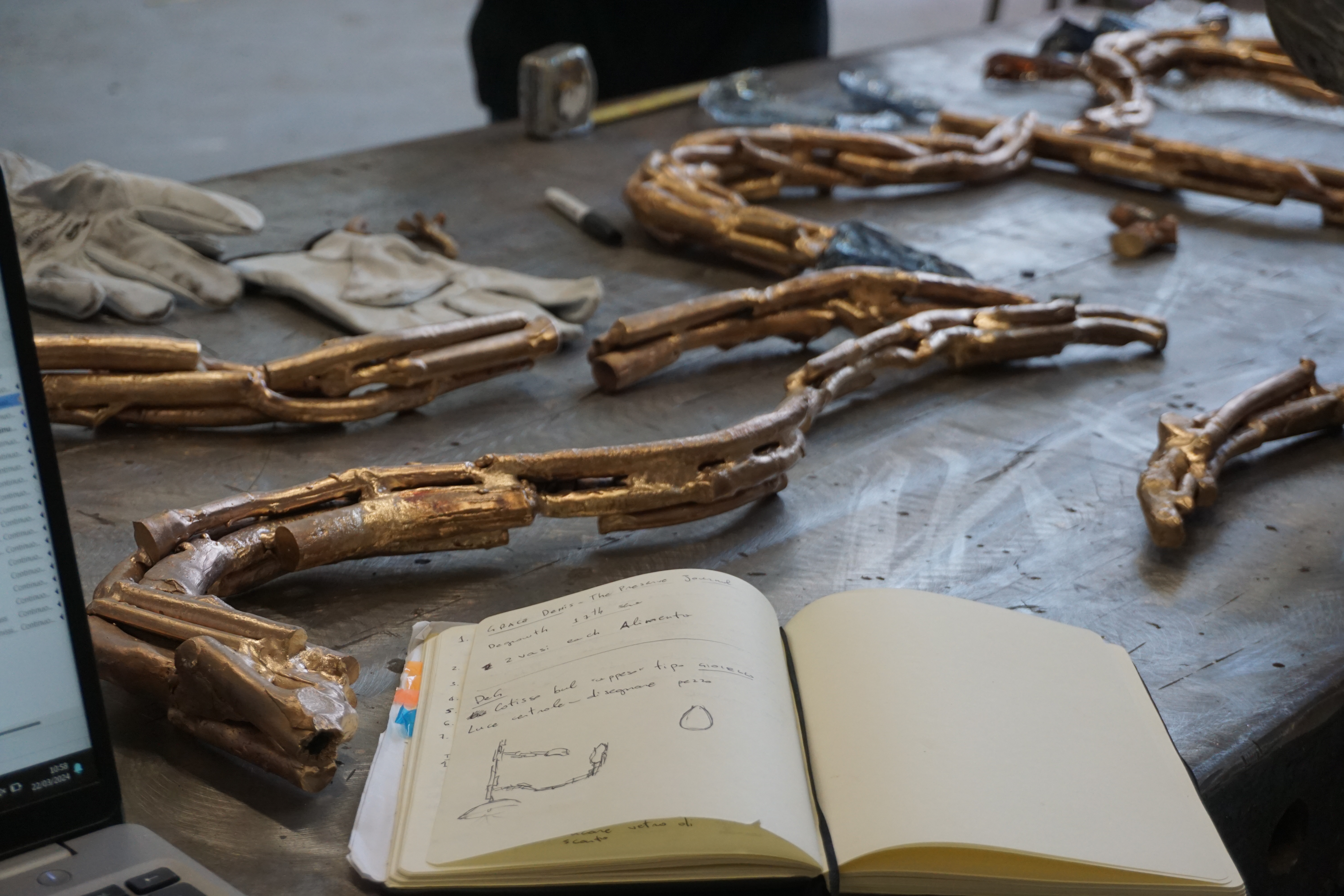 For this reason, I decided to use the sprus from Fonderia Battaglia, which are usually sent to a specific facility to be melted, purified and then used again to create artworks, as a construction material to create the shape of the objects, this resulted in a primitive process where the different pieces of different size were welded together tending to achieve the shape of an archetypical chandelier.
